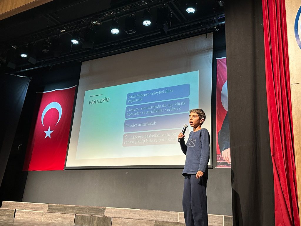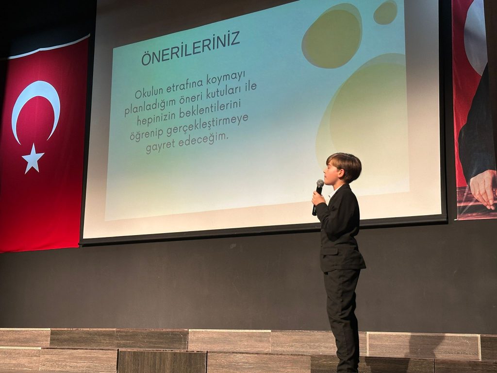 Aday öğrenciler, 8-15 Ekim 2025 tarihleri arasında gerçekleştirdikleri seçim kampanyalarında; projelerini arkadaşlarına anlattılar, sınıfları gezerek vaatlerini paylaştılar ve okulun farklı alanlarına astıkları afiş ve sloganlarla destek aradılar. Teneffüs aralarında gerçekleştirdikleri mini tanıtım turlarıyla öğrencilerin ilgisini çeken adaylar 15 Ekim 2025 Çarşamba günü okulumuz konferans salonunda yaptıkları sunumla tüm öğrencilere seslerini duyurdular ve örnek bir seçim süreci yürüttüler.
