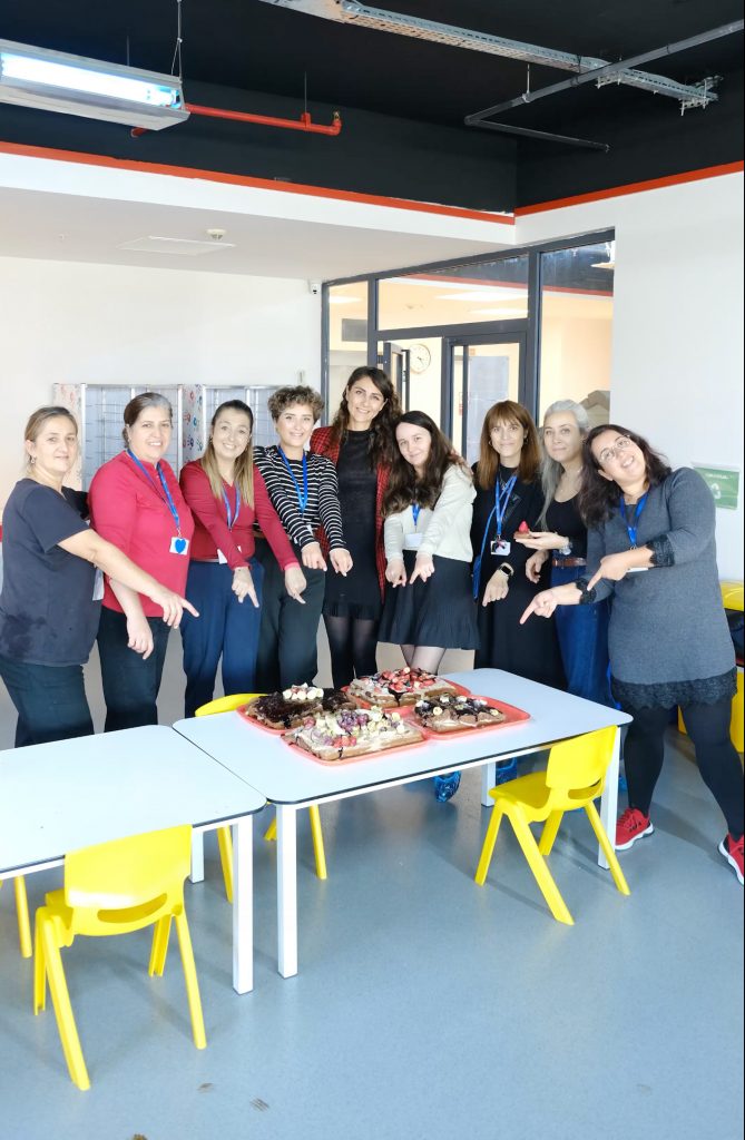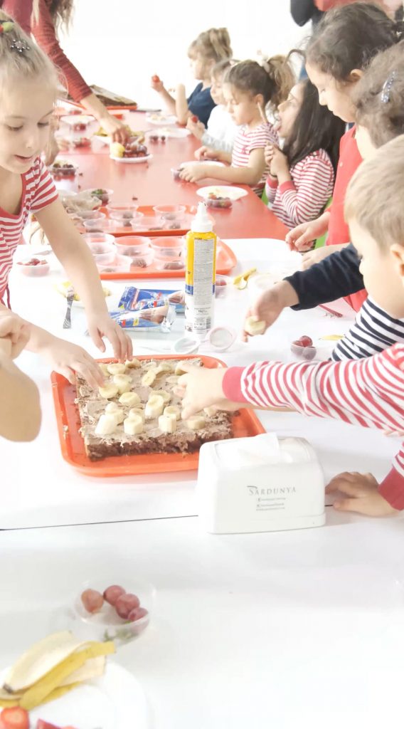 Çilekli, muzlu ve çikolatalı pastalar arasından en çok oyu alan pasta hep birlikte hazırlanıp afiyetle yendi.