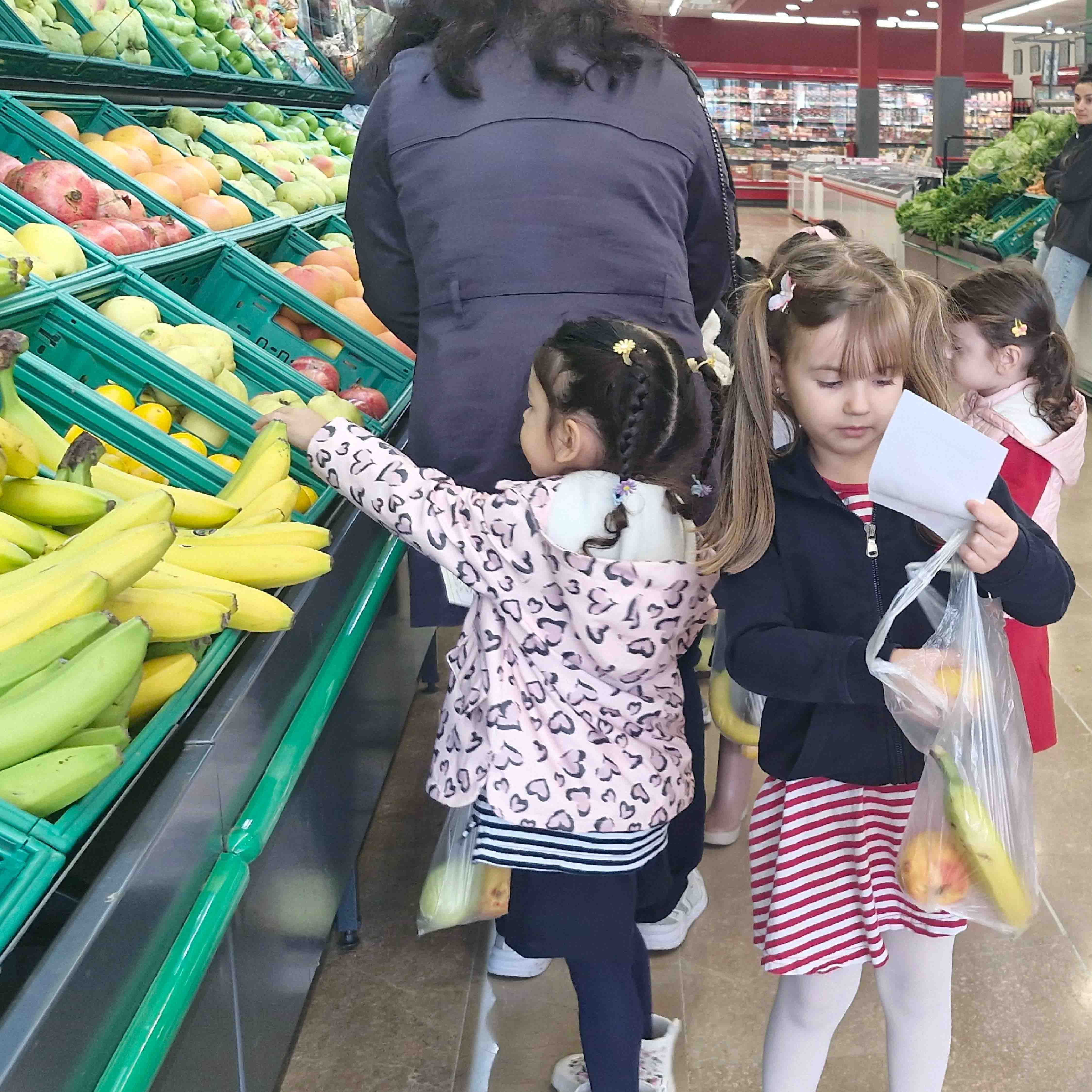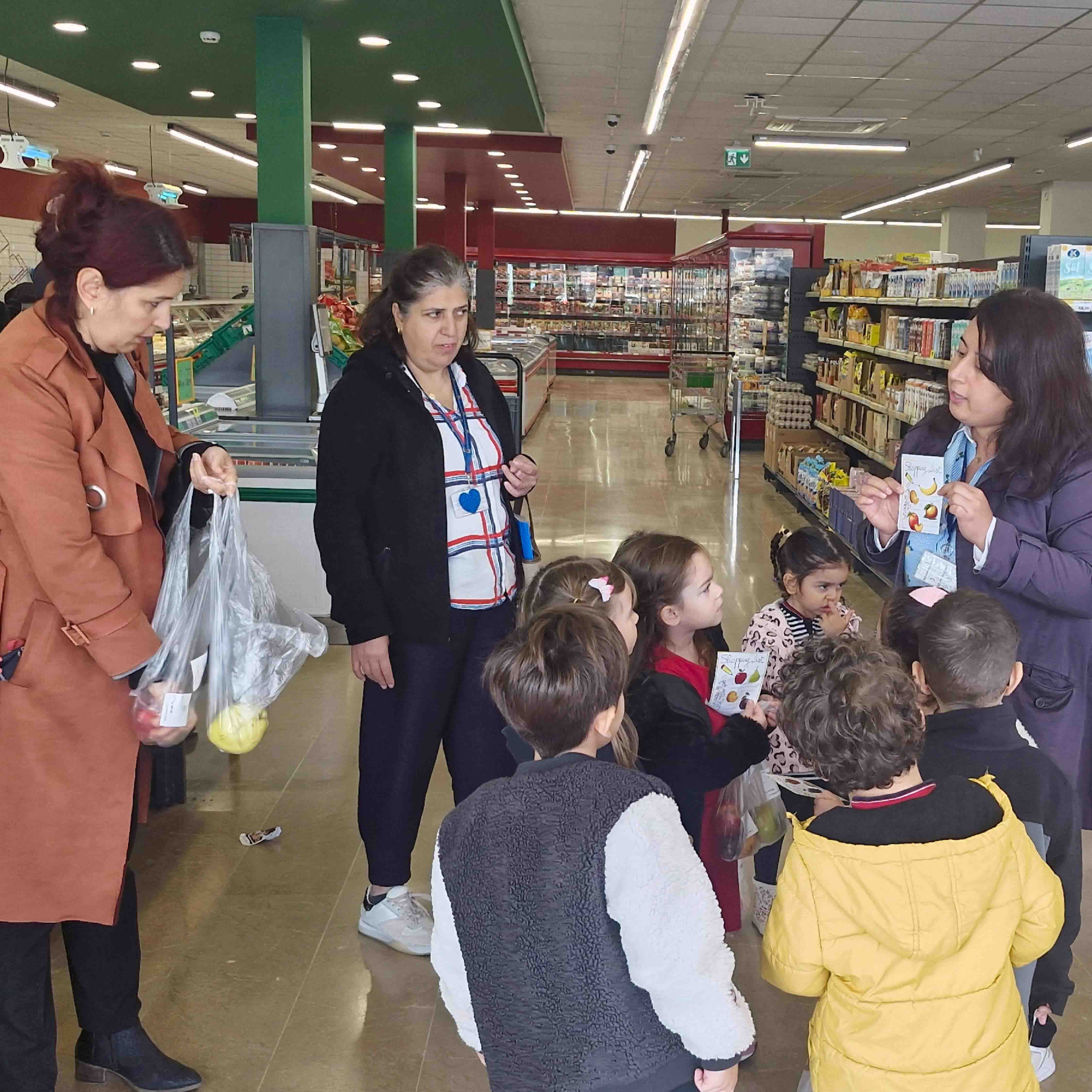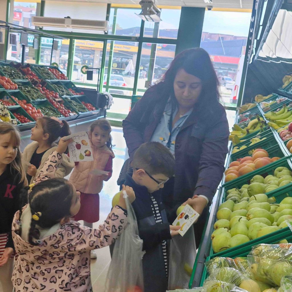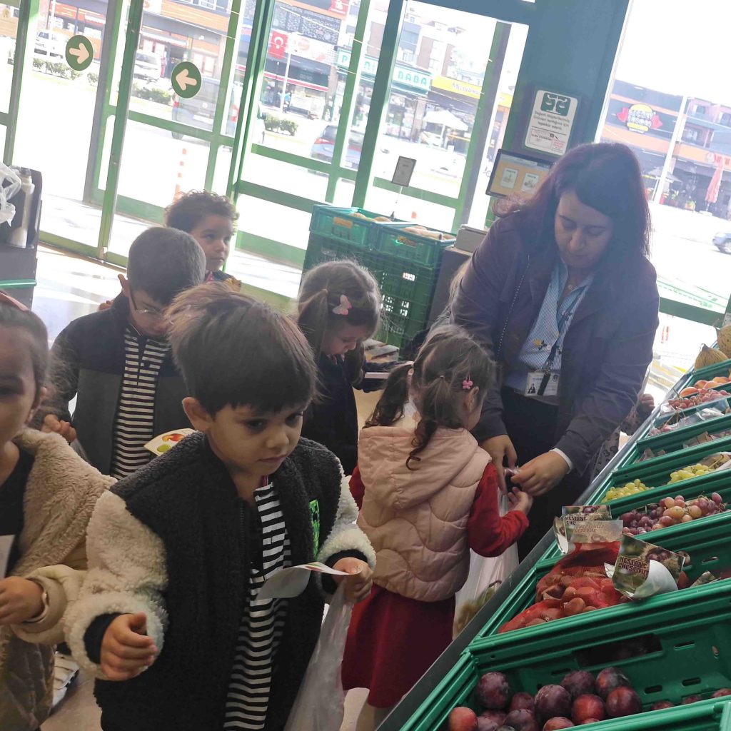 Öğrenciler, öğretmenleri eşliğinde marketteki manav tezgâhlarını gezerek sebze ve meyveleri yakından tanıdı; renkleri, kokuları ve faydaları hakkında bilgi edindi. Alışveriş listesi hazırlamanın önemi üzerine sohbet ettiler; “sağlıklı–sağlıksız”, “az–çok” ve “kilo” kavramlarını öğrendiler, meyvelerle ritmik sayma etkinlikleri yaptılar.