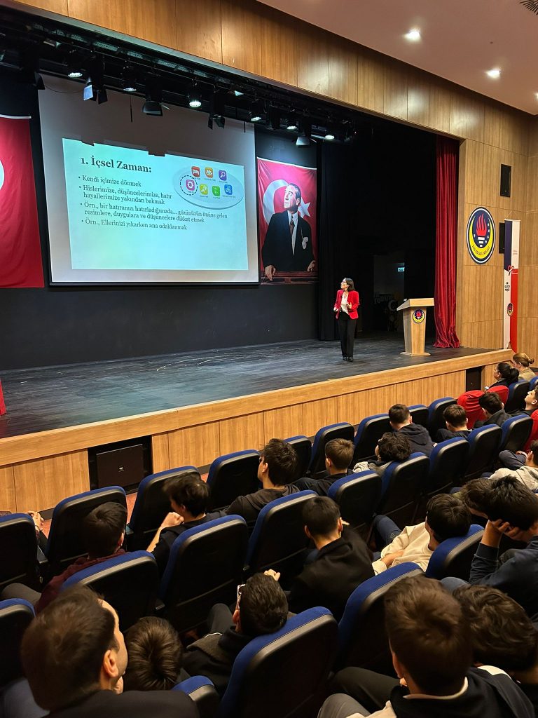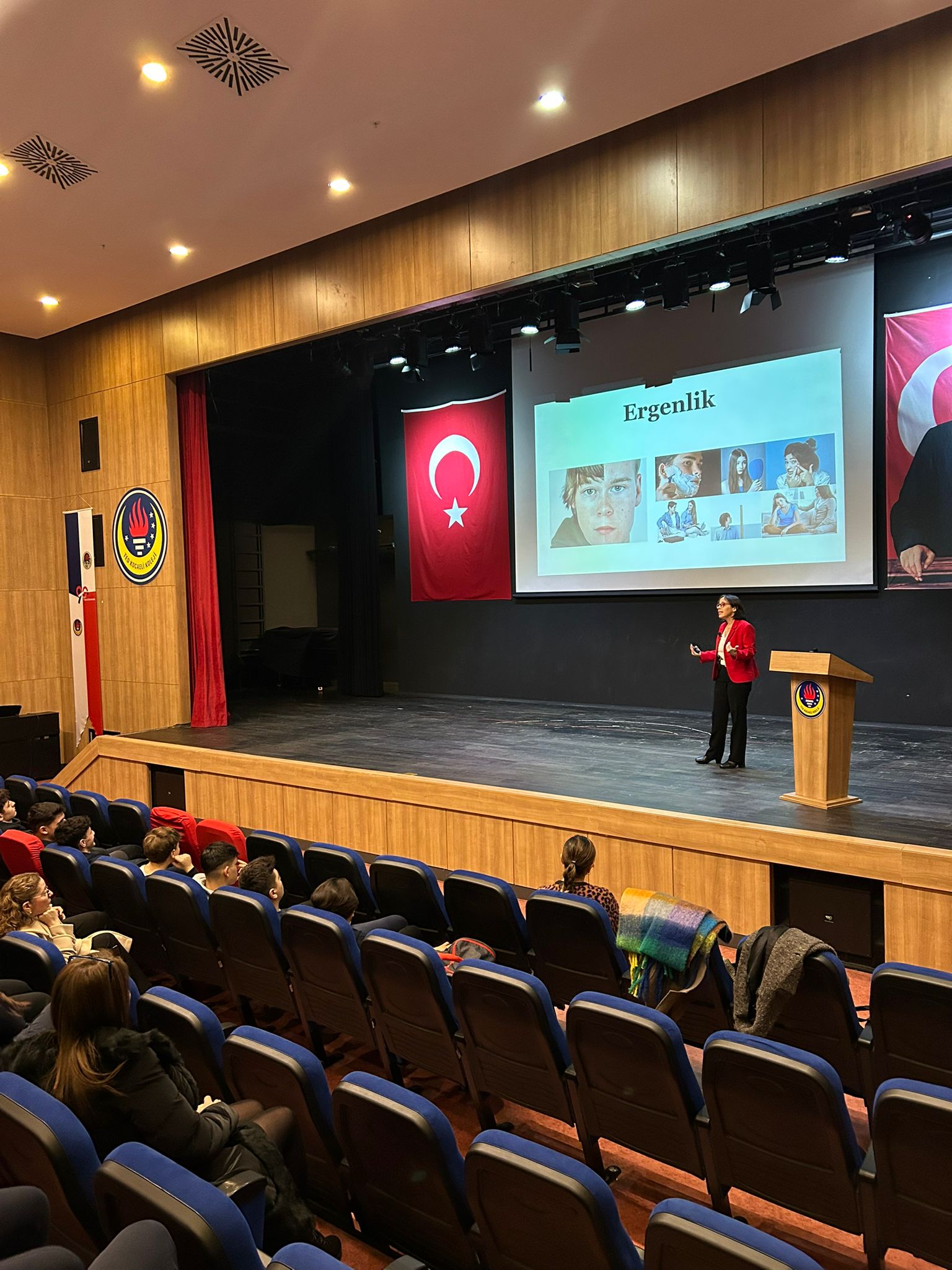 Sunumda, ergenlik döneminin zorlu ve karmaşık psikolojik süreçlerine değinilirken, bu dönemde yaşanan duygusal dalgalanmalar, stresle başa çıkma yöntemleri ve psikolojik sağlamlık konuları üzerinde duruldu. Dr. Feyza Çorapçı, öğrencilerimize bu dönemde psikolojik olarak sağlıklı gelişim için gereken stratejileri anlattı.