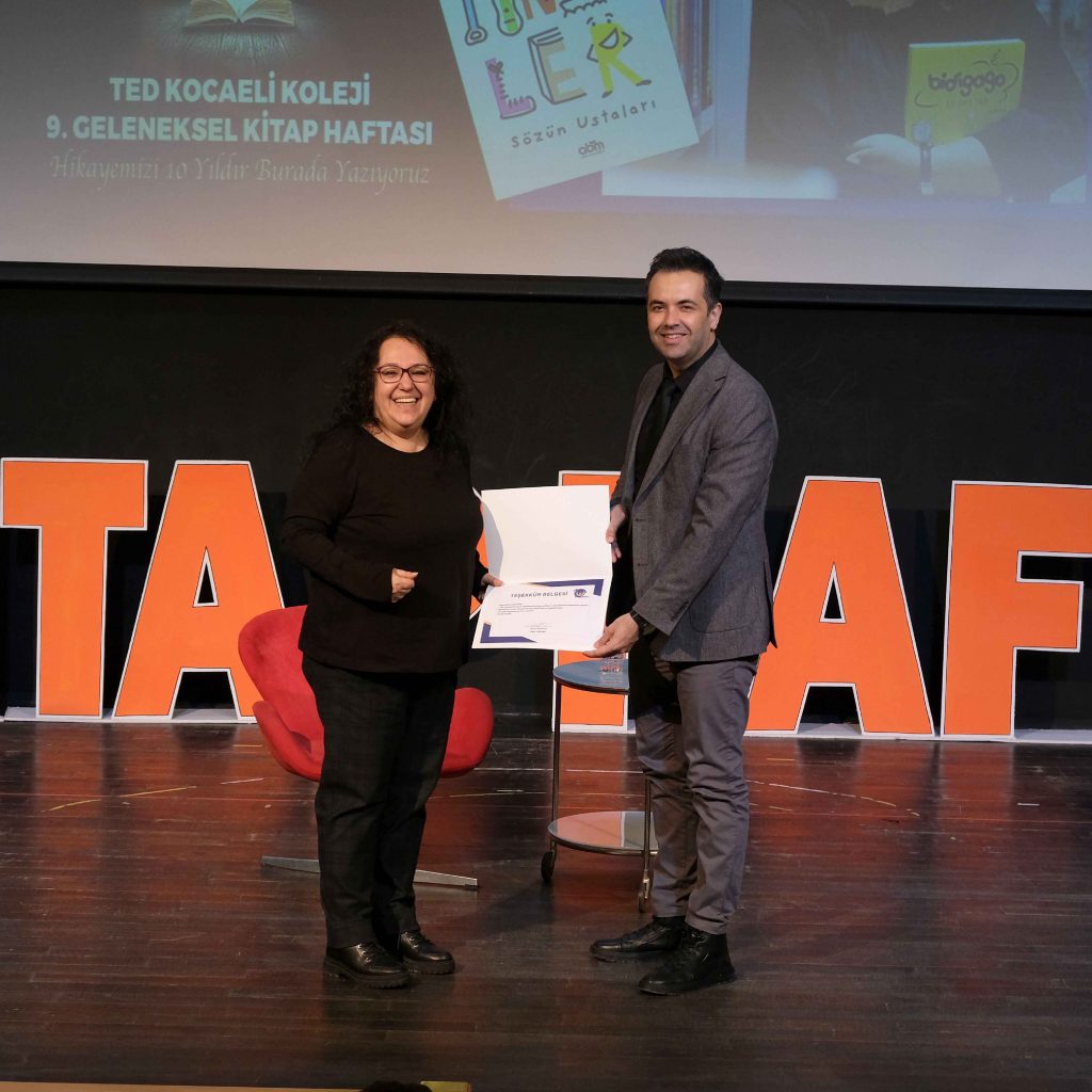 “Hikayemizi On Yıldır Burada Yazıyoruz” temasıyla yola çıkan 9. Geleneksel TED Kocaeli Koleji Kitap Haftası nöro-bilim uzmanı, akademisyen-yazar Serkan Karaismailoğlu’nun okulumuza konuk olmasıyla birlikte coşkuyla başladı. 12/A sınıfı öğrencilerinden Naz Aleyna Aydın’ın piyano dinletisiyle başlayan program 11/C sınıfı öğrencilerimizden Dila Ören’in sunumuyla birlikte keyifli bir şekilde gerçekleşti.  İlkokul Müdürümüz İlkay Çakmak, Kitap Haftasının ve okumanın önemini vurgulayan konuşmasını yaptı. Bu anlamlı konuşmanın ardından sahneye çıkan Serkan Karaismailoğlu, 8. Sınıf ve Lise öğrencilerimizle keyifli bir söyleşi gerçekleştirdi. Söyleşi sonunda öğrencilerimizden gelen soruları yanıtlayan konuğumuzu öğrencilerimiz heyecanla dinledi. Söyleşinin sonunda okul müdürlerimizin konuğumuza TED Burs Fonuna kendisi adına yaptıkları bağış sertifikasını takdim etmesiyle söyleşi sona erdi.