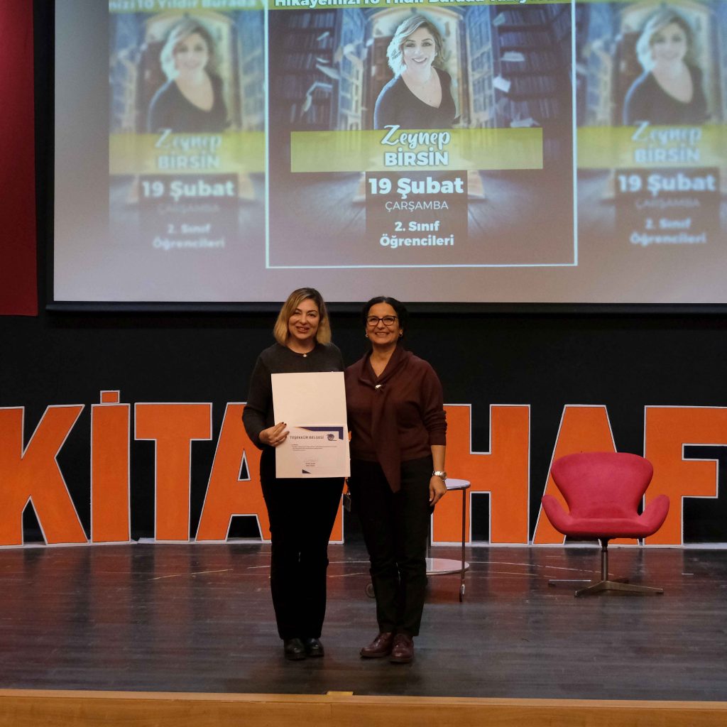 Günün ikinci yazar buluşmasında ise ortaokul 5 ve 6. sınıf öğrencilerimiz, okulumuzun konferans salonunda “Off, Dilim!” adlı kültür kitabımızın yazarı Feyza Hepçilingirler ile buluştu. Söyleşi, konuğumuzun Türkçemizin düzgün kullanılmasının önemini ifade eden konuşmasıyla başladı. Ardından yazarımız ‘’Off, Dilim!’’ adlı kültür kitabı hakkında paylaşımlarda bulundu. Öğrencilerimizin sorularını büyük bir içtenlikle cevaplayan Sayın Feyza Hepçilingirler ile keyifli bir sohbet gerçekleştirildi.