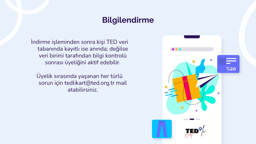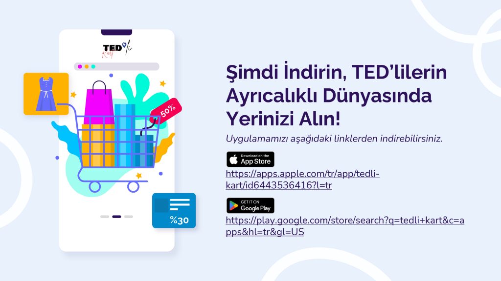 TED Ailesi üyelerine sağlanan avantajları keşfetmek için “TED’li Kart”’ uygulamasını app store ve play store’dan indirebilirsiniz.